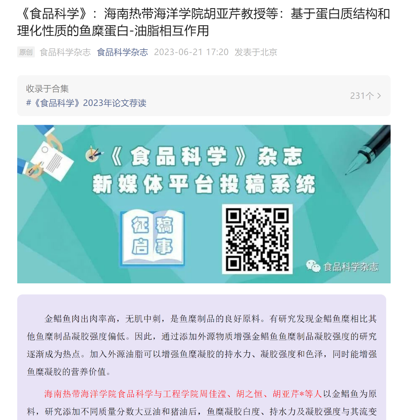 公司bevictor1946韦德官网教授胡亚芹团队最新研究成果“基于蛋白质结构和理化性质的鱼糜蛋白-油脂相互作用”被国内食品领域顶级中文期刊《食品科学》录用。鉴于论文研究结果为同行评审高度认可,《食品科学》杂志作为热点文章在其官微上公开发文荐读。