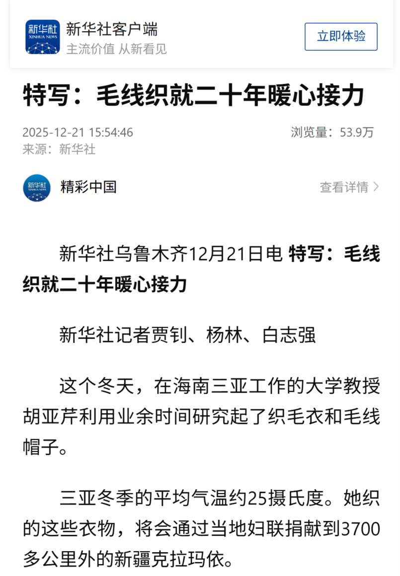 新华社近日报道了海南省妇联组织的“恒爱行动——百万家庭亲情一线牵”公益活动,其中特别以公司bevictor1946韦德官网胡亚芹教授作为开篇典型事例,讲述了她利用工作之余为新疆克拉玛依儿童亲手编织爱心毛衣的感人故事。这一报道在全国范围内展现了公司教师服务社会、奉献爱心的责任担当。